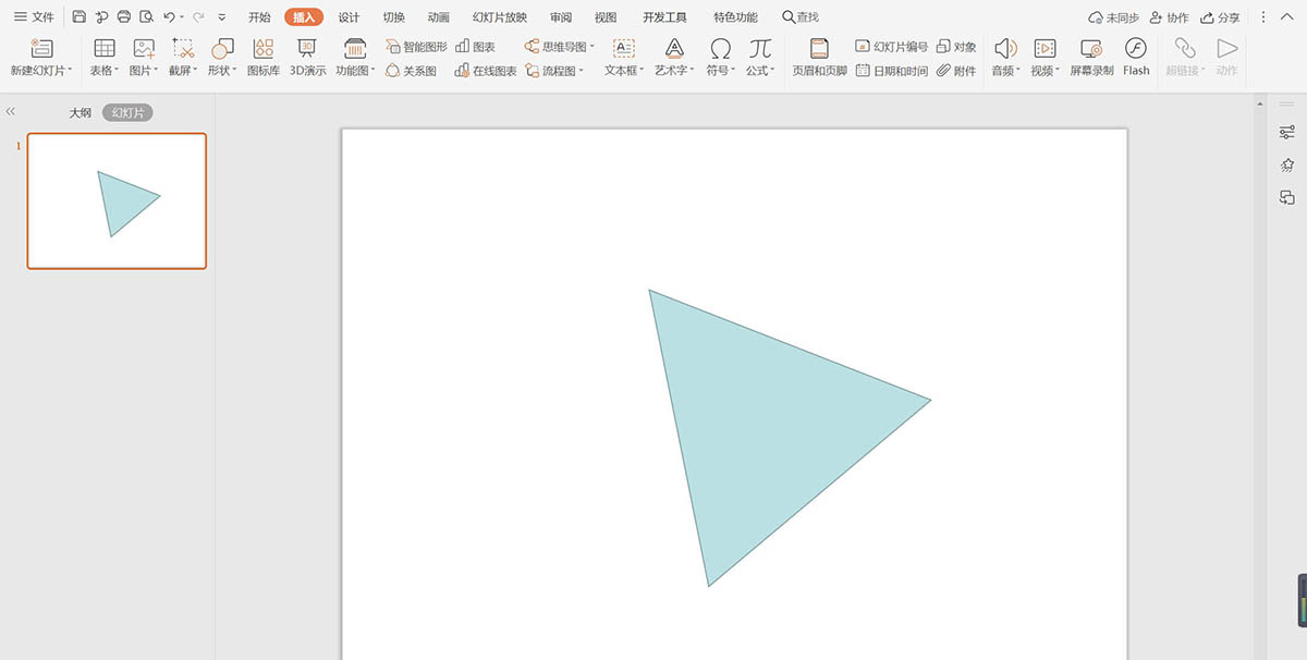 1、在插入選項卡中點擊形狀,選擇其中的等腰三角形,在頁面上繪制出形狀。