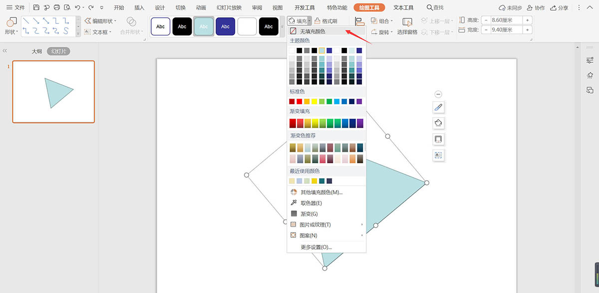 2、選中等腰三角形,在繪圖工具中點擊填充,選擇其中的“無填充顏色”。