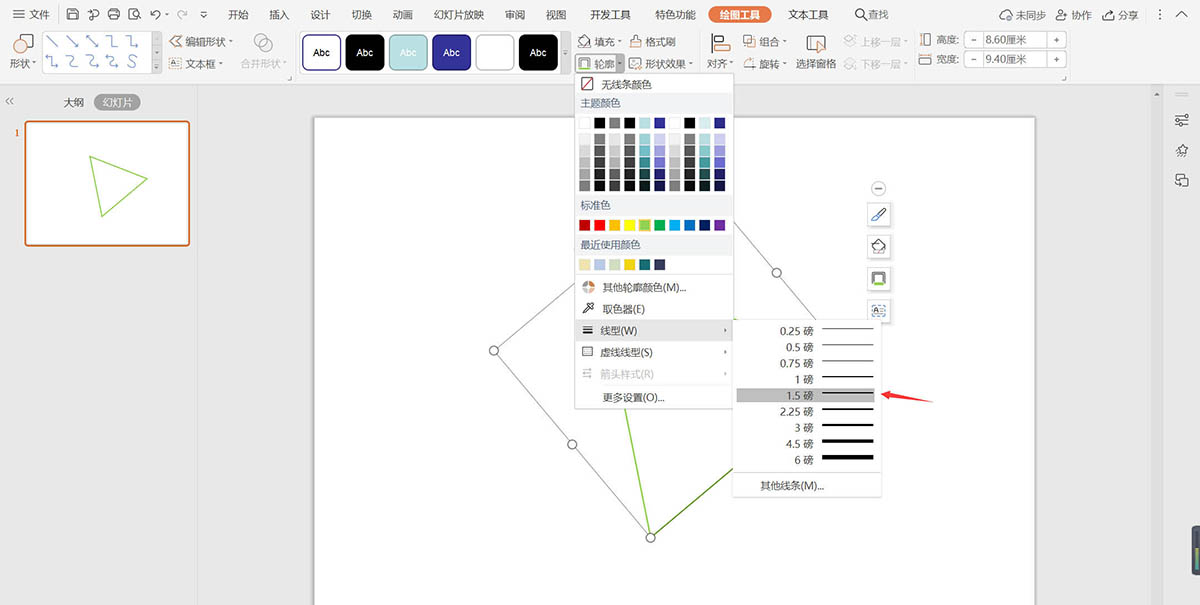 3、點擊輪廓,線條顏色填充為綠色,線條寬度設置為1.5磅。