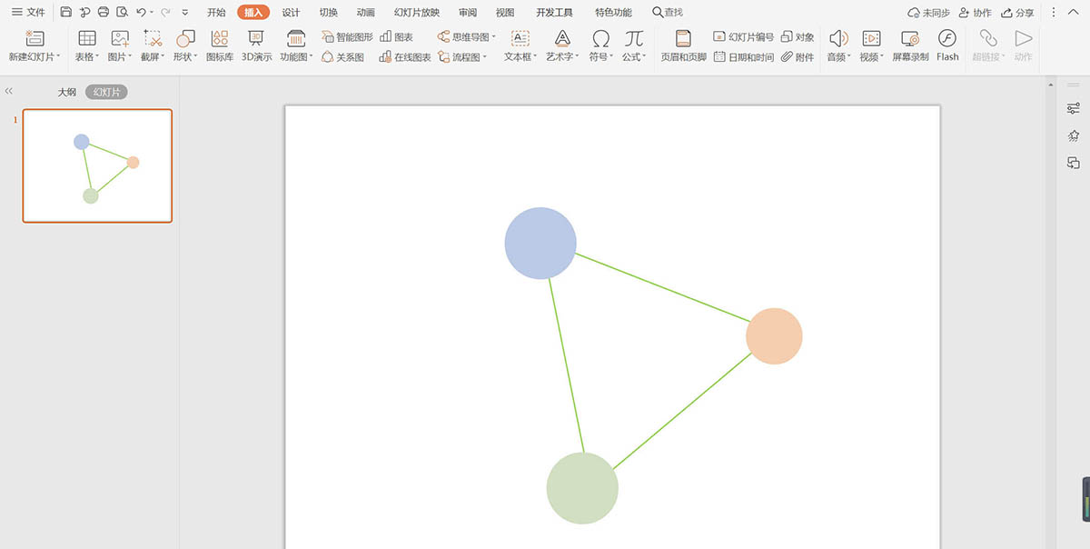 4、然后再插入三個圓形,填充上合適的顏色,放置在三角形的三個角上,位置和大小如圖所示。