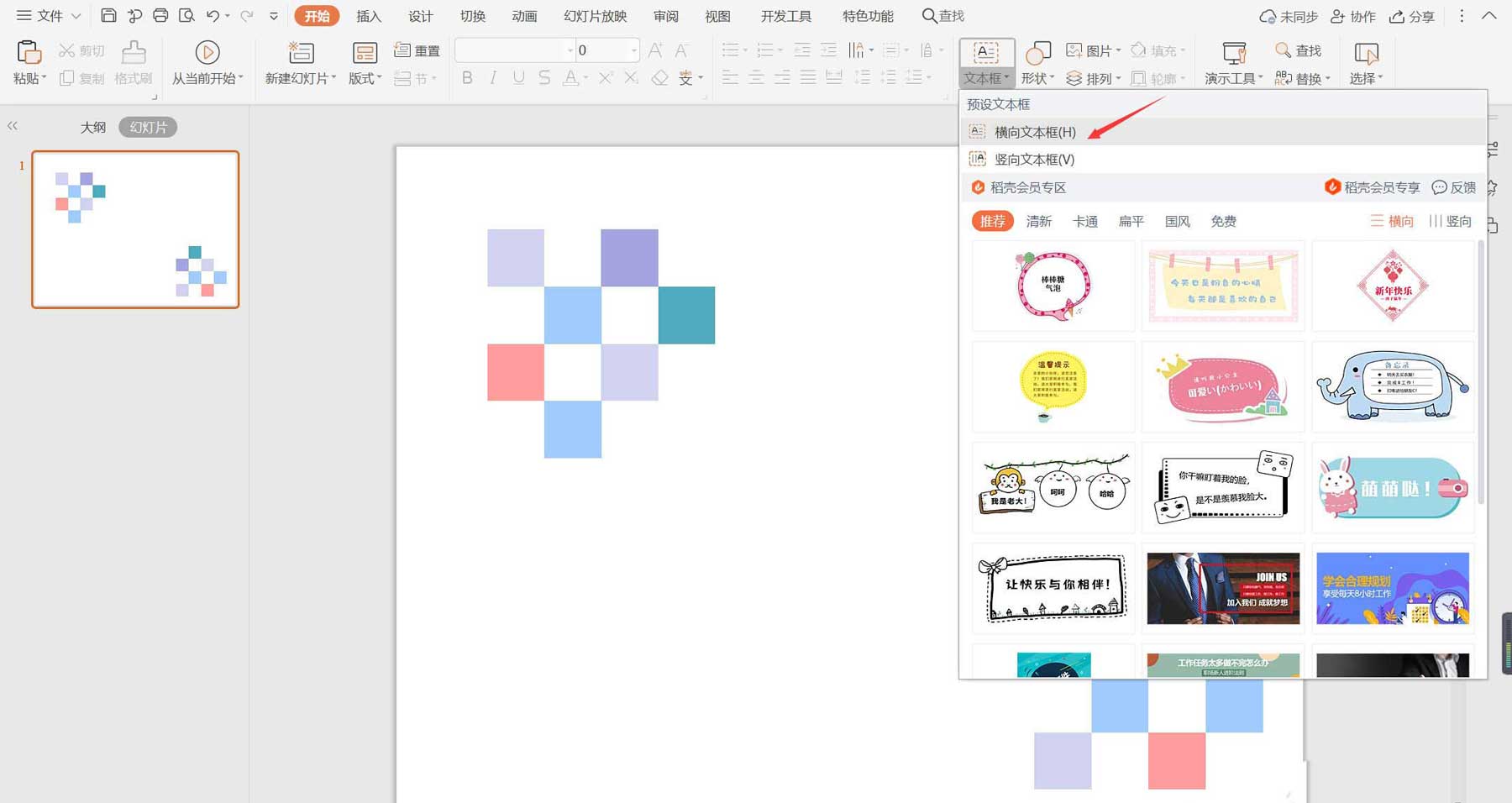 5、在開始選項(xiàng)卡中點(diǎn)擊文本框,選擇其中的橫向文本框。