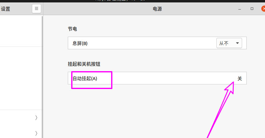 4、在【電源】中單擊【自動(dòng)掛起】,默認(rèn)【自動(dòng)掛起】為關(guān)閉狀態(tài)。