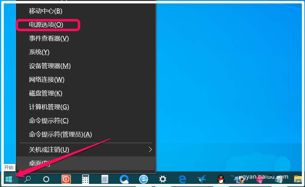 1、右鍵點(diǎn)擊系統(tǒng)左下角【開始】菜單,在開始菜單中點(diǎn)擊【電源選項(xiàng)】;