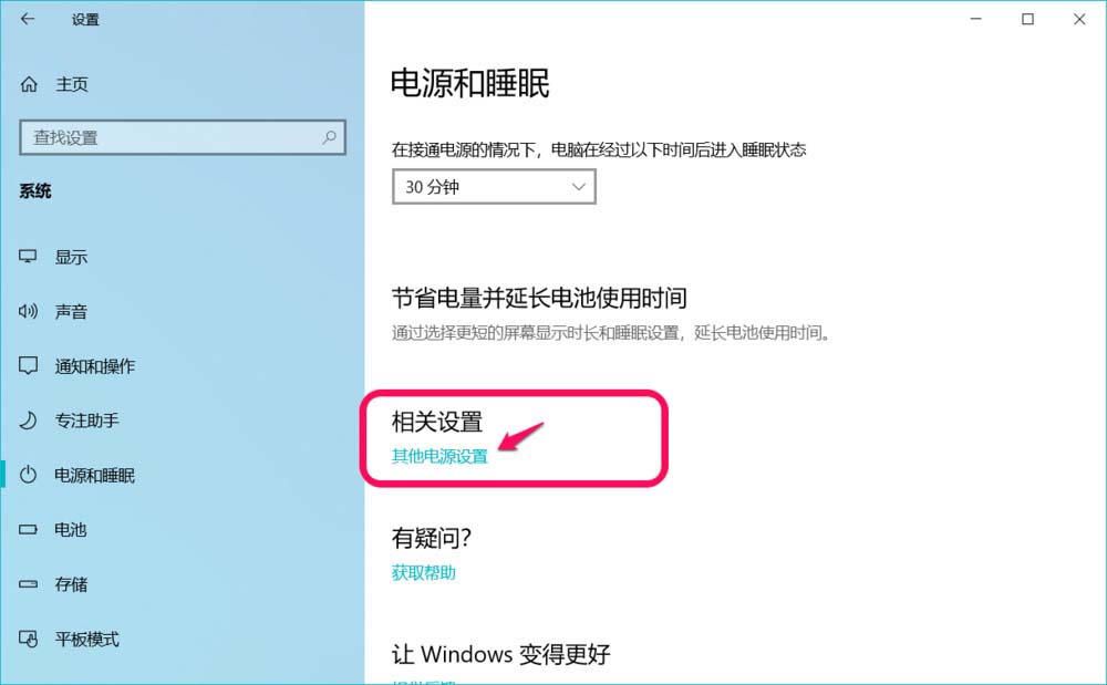 2、在打開的系統(tǒng)設(shè)置 - 電源和睡眠窗口中,我們點(diǎn)擊:相關(guān)設(shè)置 - 其他電源設(shè)置;