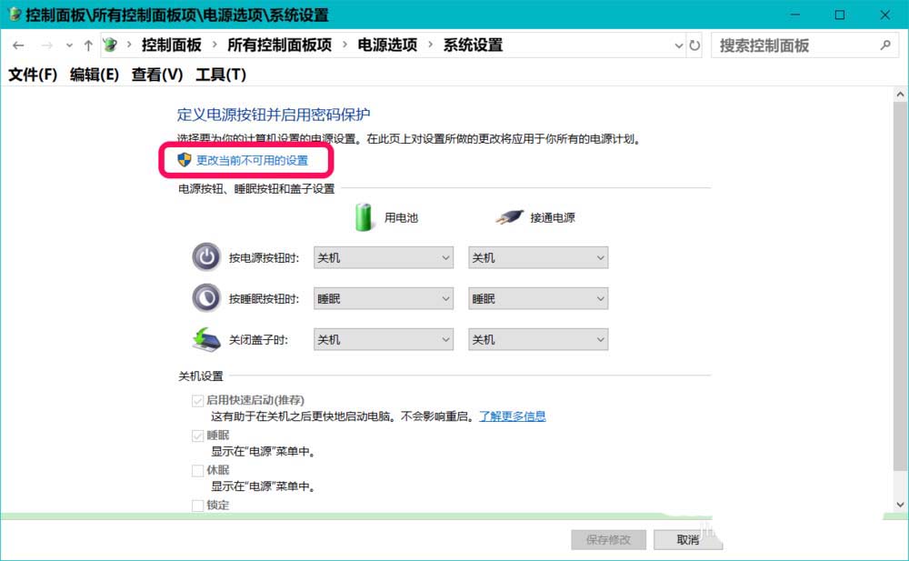 4、接下來我們點(diǎn)擊 定義電源按紐并啟用密碼保護(hù) 下的 更改當(dāng)前不可用設(shè)置;