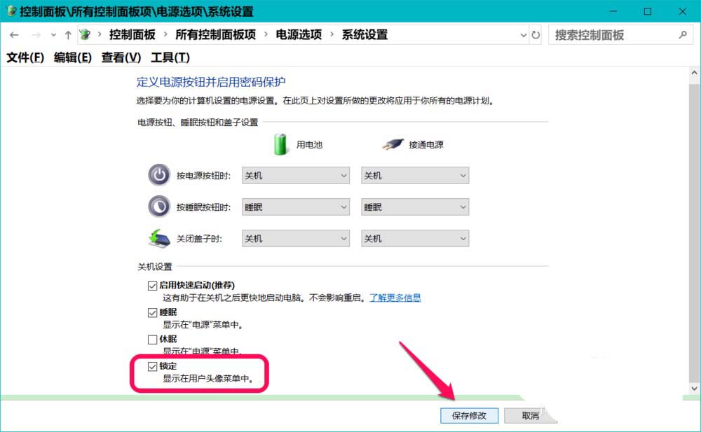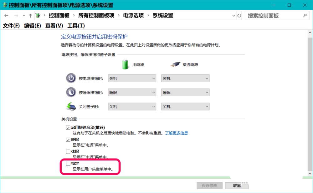 可在系統(tǒng)電源選項(xiàng)修復(fù)顯示【鎖定】按紐。