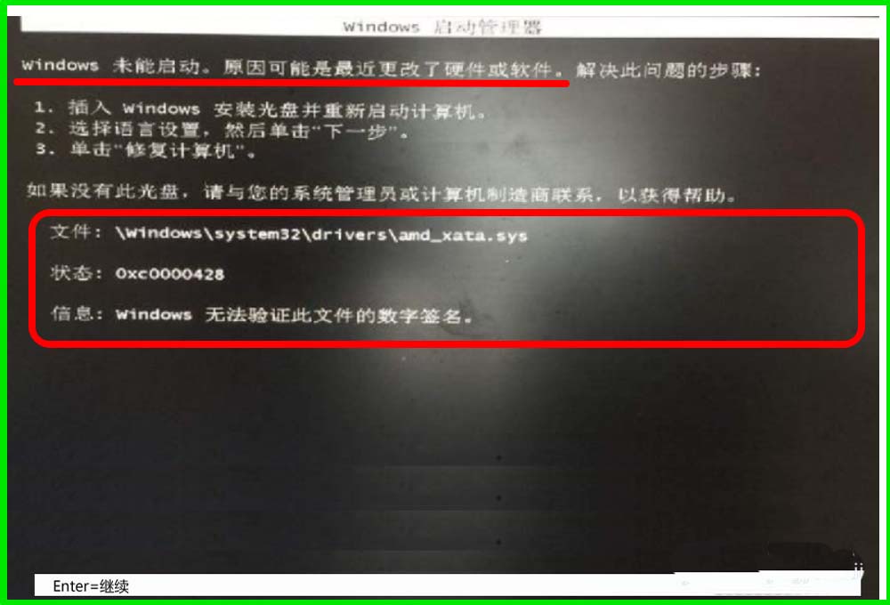 電腦安裝的是Windows 10系統(tǒng),因為安裝某些軟件或驅(qū)動程序后,無法開機(jī),提示:Windows 未能啟動。原因可能是最近更改了硬件或軟件。文件:windows\system32\drivers\amd_xata.sys。狀態(tài):0xc0000428信息:Windows無法驗證此文件的數(shù)字簽名。如何解決Windows 無法驗證此文件數(shù)字簽名的問題呢?