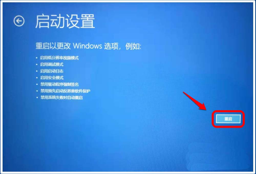 在啟動設(shè)置窗口中,重啟以更改 Windows 選項,例如:……禁用驅(qū)動程序強(qiáng)制簽名。我們點擊:重啟;