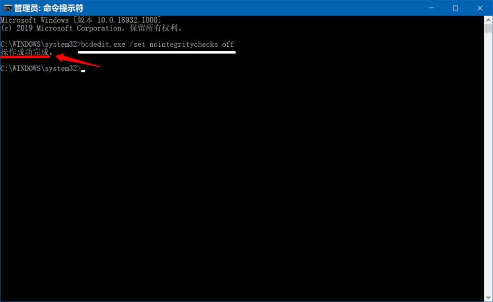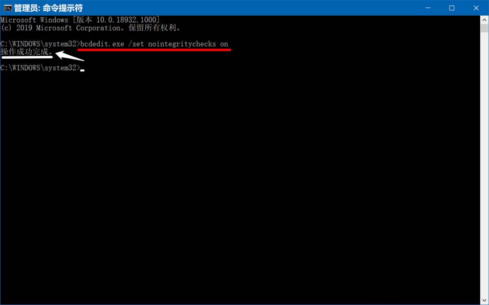 復(fù)制:bcdedit.exe /set nointegritychecks off 命令到命令提示符窗口中,按下鍵盤上的回車鍵,顯示:操作成功完成。