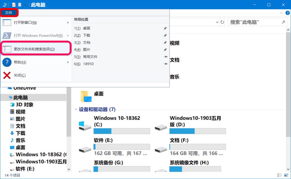 1、點(diǎn)擊資源管理器窗口左上角的【文件】,在展開的菜單中點(diǎn)擊:更改文件和搜索選項(xiàng);
