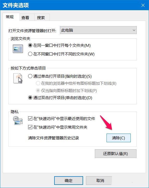2、此時打開 Windows 10 文件夾選項(xiàng) 窗口,在文件夾選項(xiàng)窗口中,我們可以看到有一個【隱私】項(xiàng),點(diǎn)擊 清除文件資源管理器歷史記錄:清除;