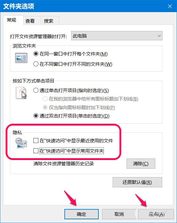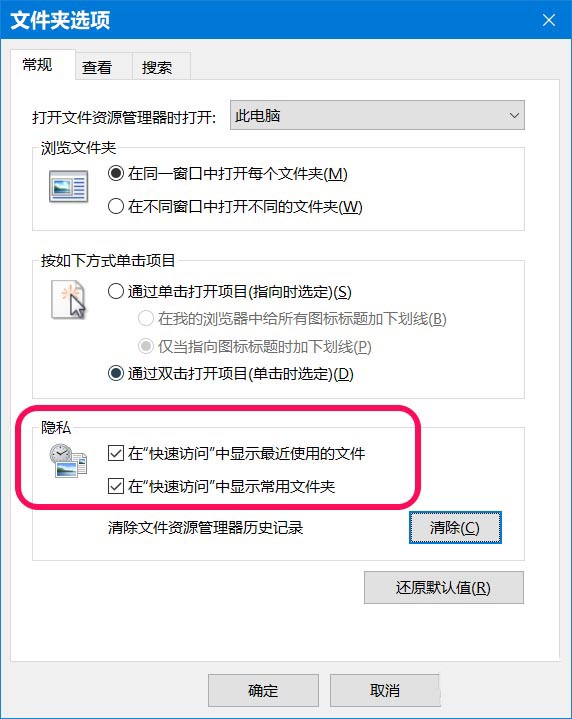 4、我們再次進(jìn)入【文件夾選項(xiàng)】窗口中,可以看到【隱私】下: