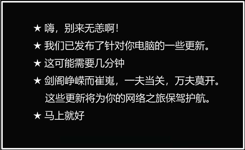 電腦第四次重新啟動后,繼續(xù)進(jìn)行系統(tǒng)更新的后續(xù)工作操作,顯示如下五個界面: