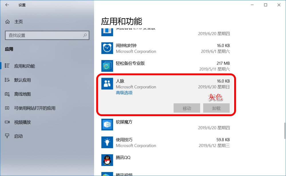 Windows 10系統(tǒng)中的應(yīng)用【人脈】,在【開(kāi)始】菜單(無(wú)卸載項(xiàng))、應(yīng)用和功能(卸載為灰色)中都無(wú)法卸載。
