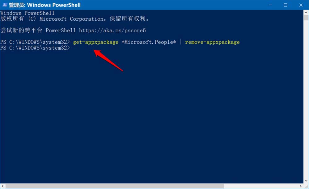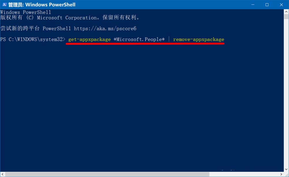 2、復(fù)制 get-appxpackage *Microsoft.People* | remove-appxpackage 命令到Windows PowerShell 窗口中;