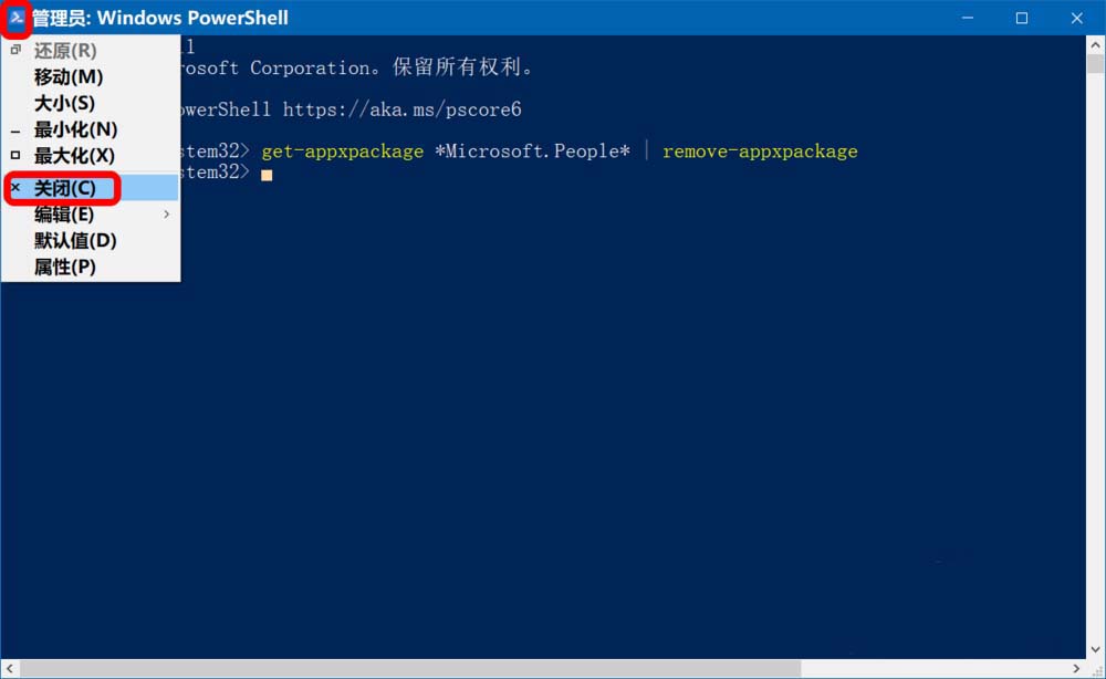 4、點(diǎn)擊窗口左上角的小框 - 關(guān)閉,退出Windows PowerShell窗口。