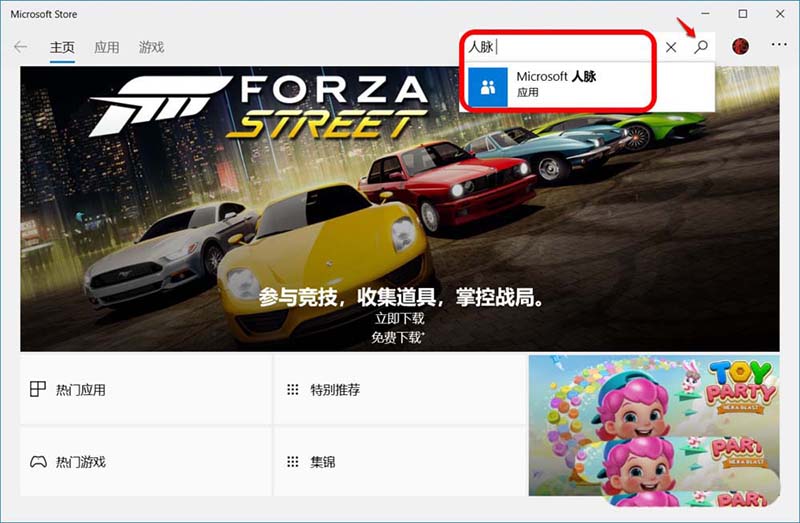 1、進(jìn)入微軟商店,在搜索欄中輸入:人脈,再點(diǎn)擊:搜索圖標(biāo);