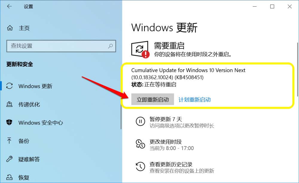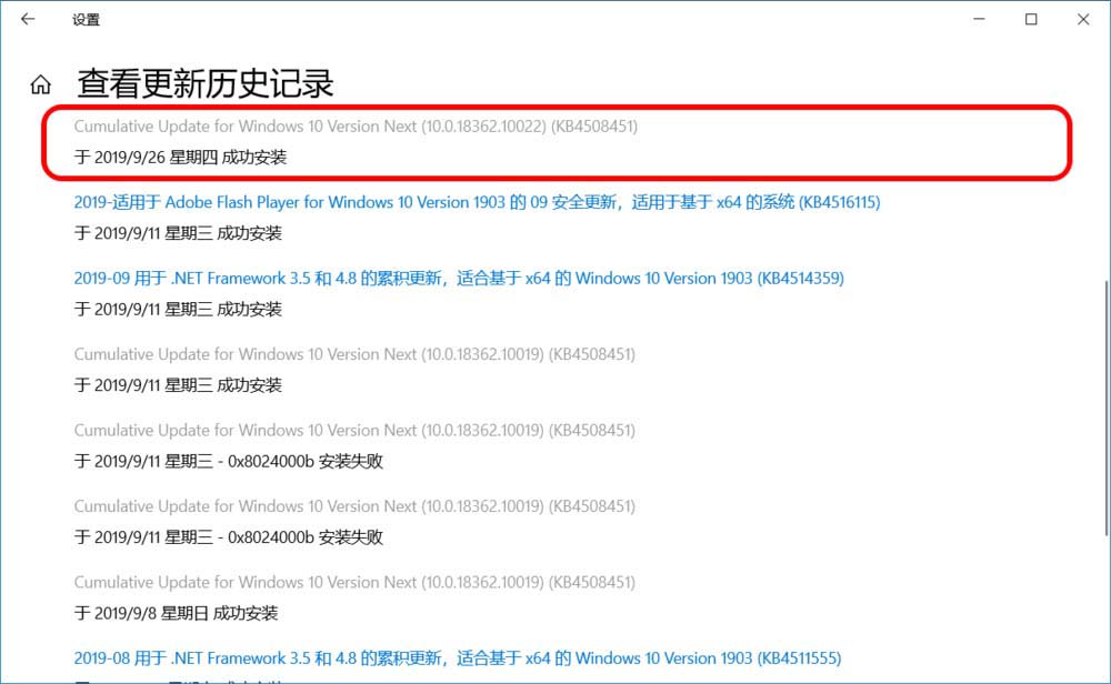 Cumulative Update for Windows 10 Version Next (10.0.18362.10024)(KB4508451) 狀態(tài):正在等待重啟