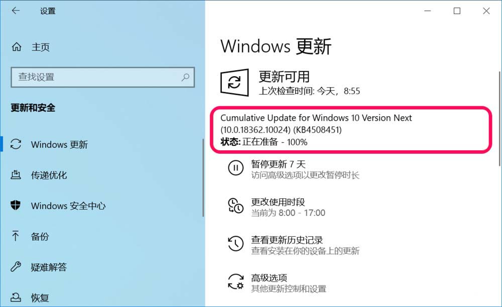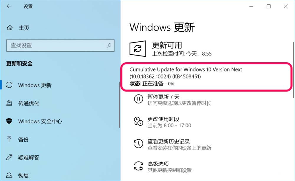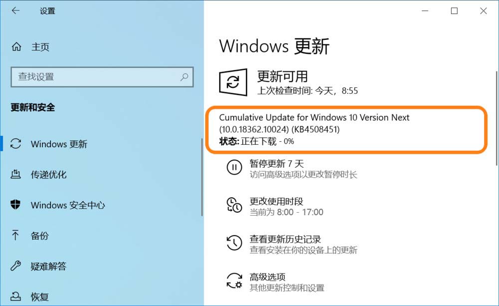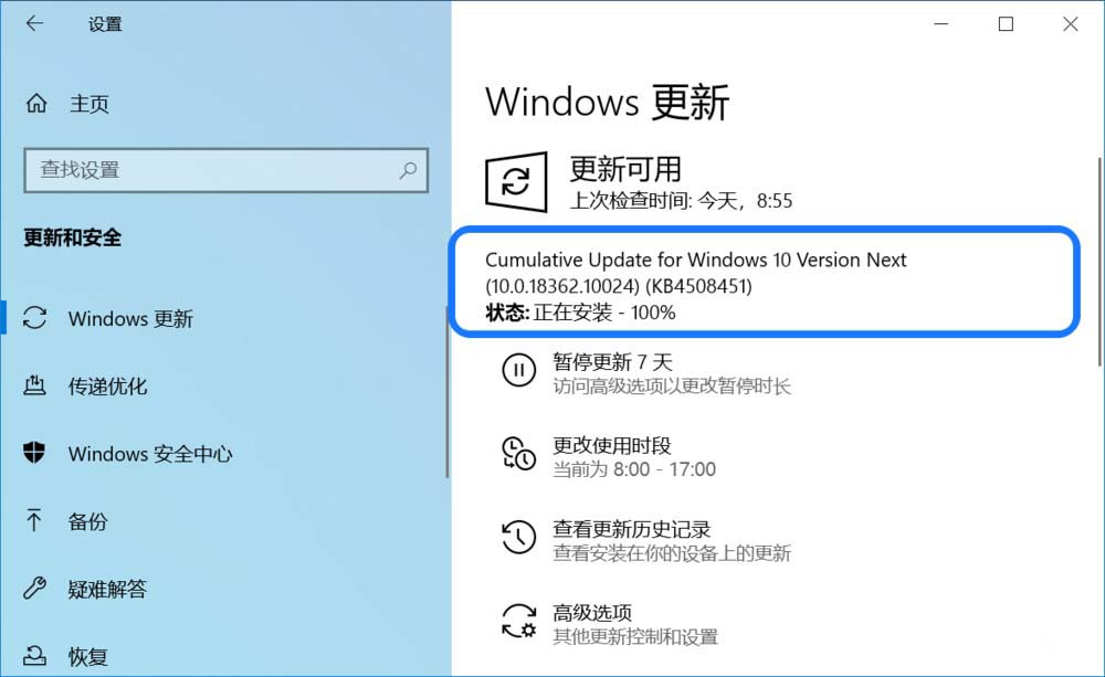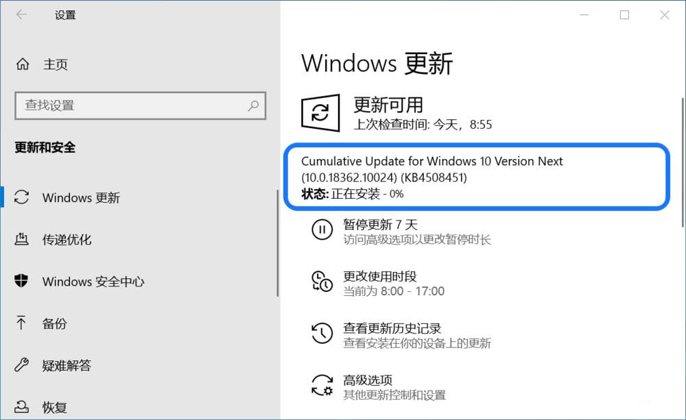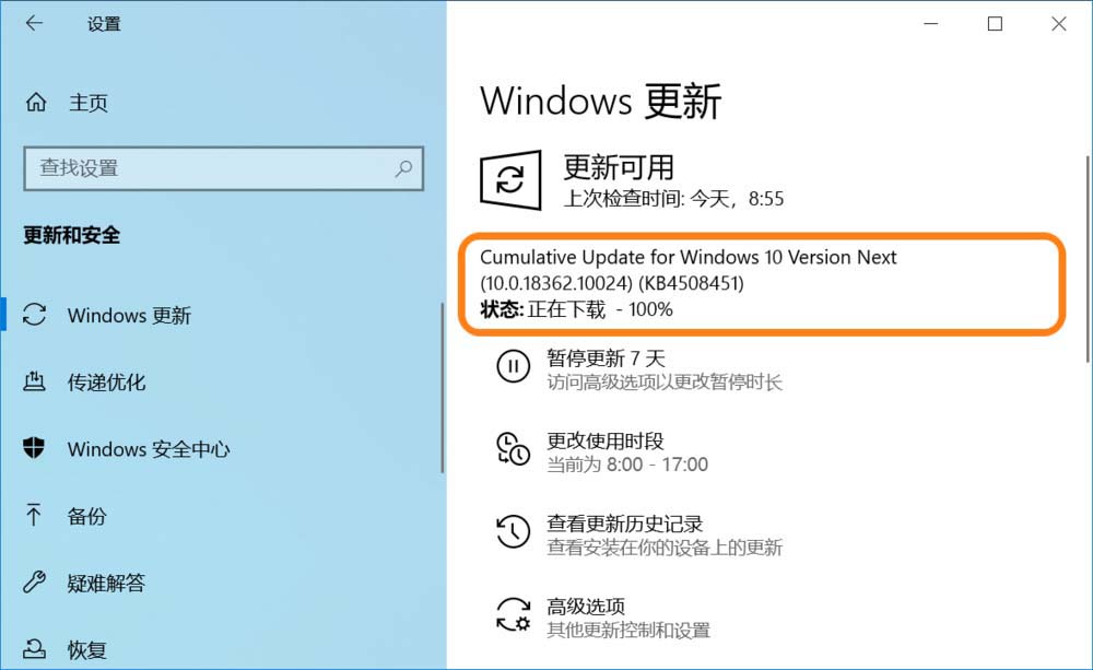 Cumulative Update for Windows 10 Version Next (10.0.18362.10024)(KB4508451) 狀態(tài):正在準(zhǔn)備 0% ~ 100%