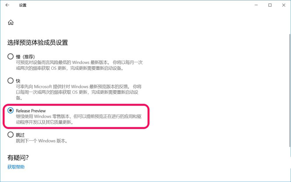 此次更新是微軟發(fā)布的 2019 Windows 10更新十一月版的預(yù)覽(Release Preview)更新,所以我們必須在【Windows 設(shè)置】-【更新和安全】-【W(wǎng)indows 預(yù)覽體驗(yàn)計(jì)劃】中,選擇 Release Preview;