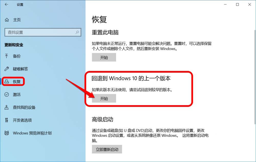 如需要更新到19013.1122版系統(tǒng),解決方法是先將19018.1版系統(tǒng)恢復(fù)到:Windows 10 Insider Preview 19013.1 (vb_release)。在Windows 設(shè)置 - 更新和安全 - 恢復(fù) 對應(yīng)右側(cè)窗口中,點擊:【回退到 Windows 10的上一個版本】下的【開始】,按照提示進(jìn)行操作;