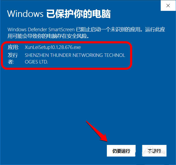 安裝Windows 10系統(tǒng)的電腦,有時在安裝應用程序時會彈出一個 Windows 已保護你的電腦 窗口:Windows Defender SmartScreen 已阻止啟動一個未識別的應用。運行此應用可能會導致你的電腦存在安全風險。Windows Defender SmartScreen 可翻譯為:Windows防御智能屏幕,如安裝最新版本的迅雷應用程序,則出現(xiàn)了上述問題。該怎么成功在win10中安裝迅雷呢?下面我們就來看看詳細的教程。