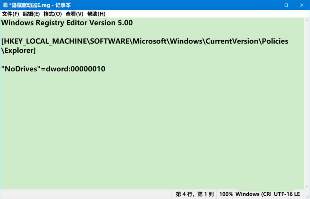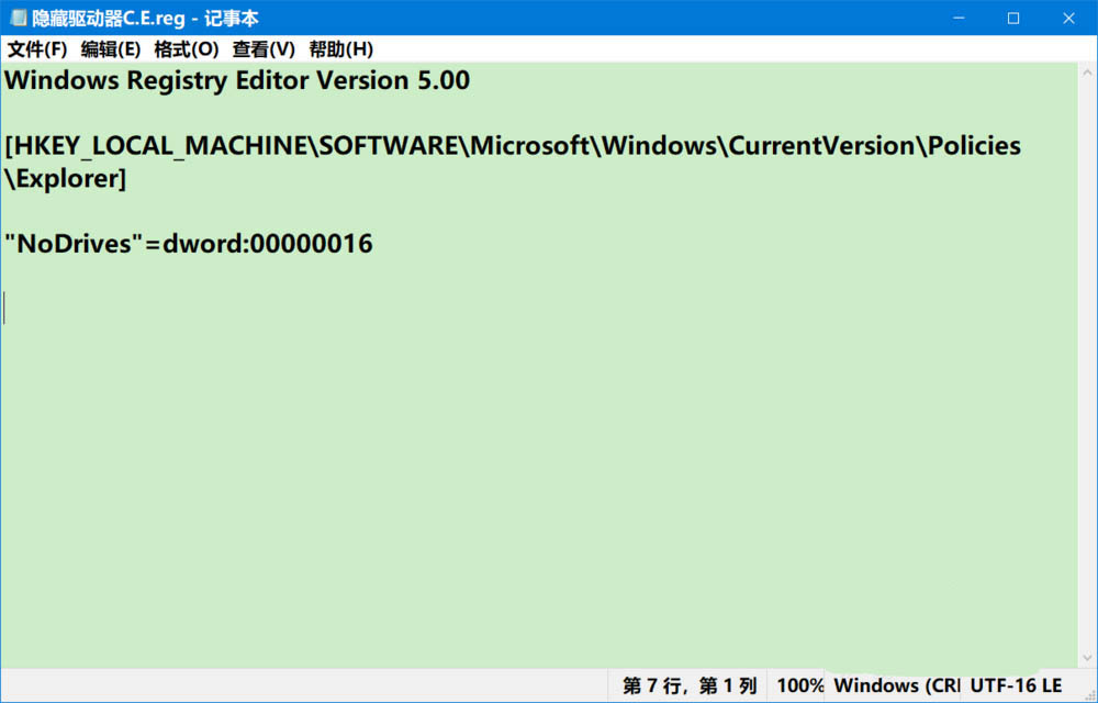 Windows Registry Editor Version 5.00 [HKEY_LOCAL_MACHINE\SOFTWARE\Microsoft\Windows\CurrentVersion\Policies\Explorer] "NoDrives"=dword:00000016