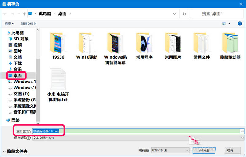 3、在打開的另存為窗口中,我們先點(diǎn)擊窗口左側(cè)的【桌面】,在文件名(N)欄中輸入:隱藏驅(qū)動(dòng)器C、E.reg,再點(diǎn)擊:保存;