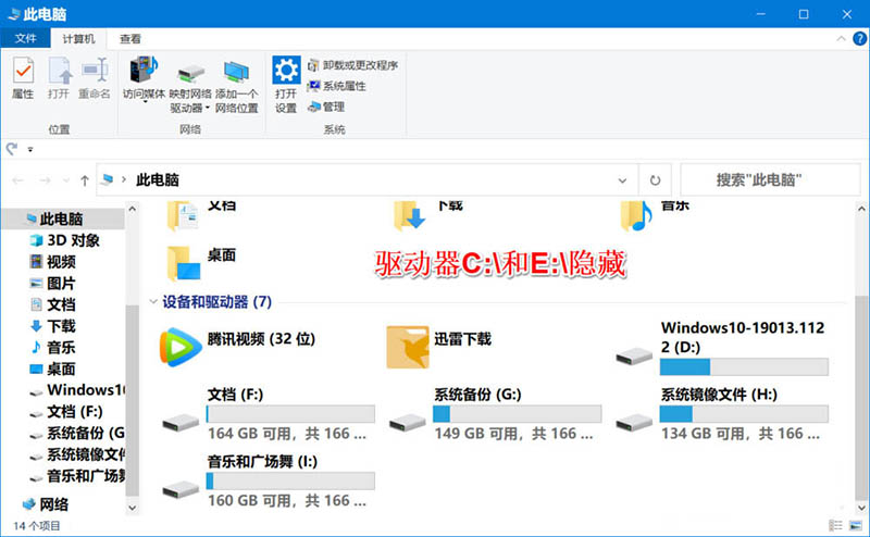 5、重啟或注銷一次電腦,登錄進(jìn)入桌面后,再進(jìn)入資源管理器,我們可以看到:驅(qū)動(dòng)器C:\和E:\已隱藏消失。