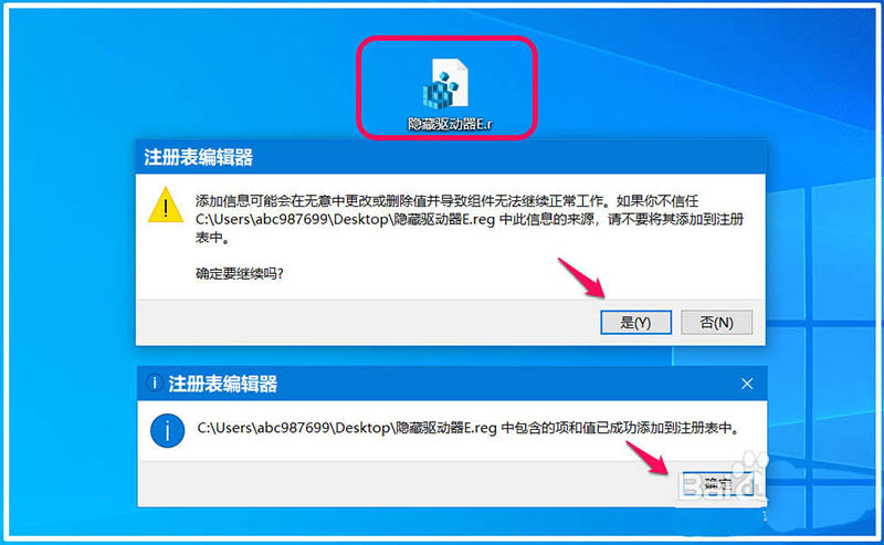 2、按照制作【隱藏驅(qū)動(dòng)器C、E.reg】注冊(cè)表文件的方法制作一個(gè)【隱藏驅(qū)動(dòng)器E.reg】注冊(cè)表文件,且左鍵雙擊,在彈出的注冊(cè)表編輯器對(duì)話框中先后點(diǎn)擊:是(Y)和確定。
