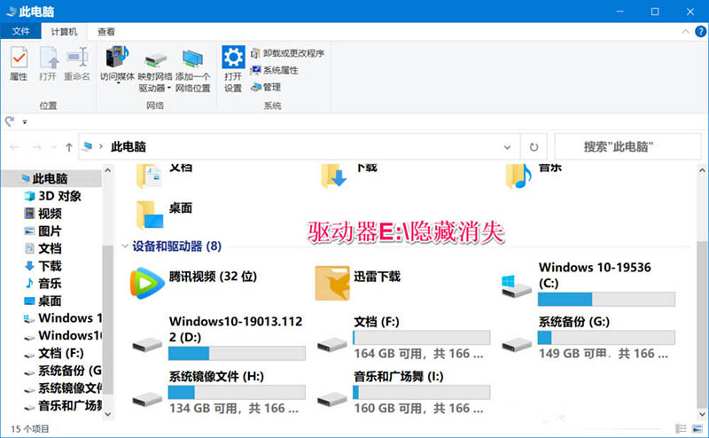 3、重啟或注銷一次電腦,登錄進(jìn)入桌面后,再進(jìn)入資源管理器,我們可以看到:驅(qū)動(dòng)器E:\已隱藏消失。