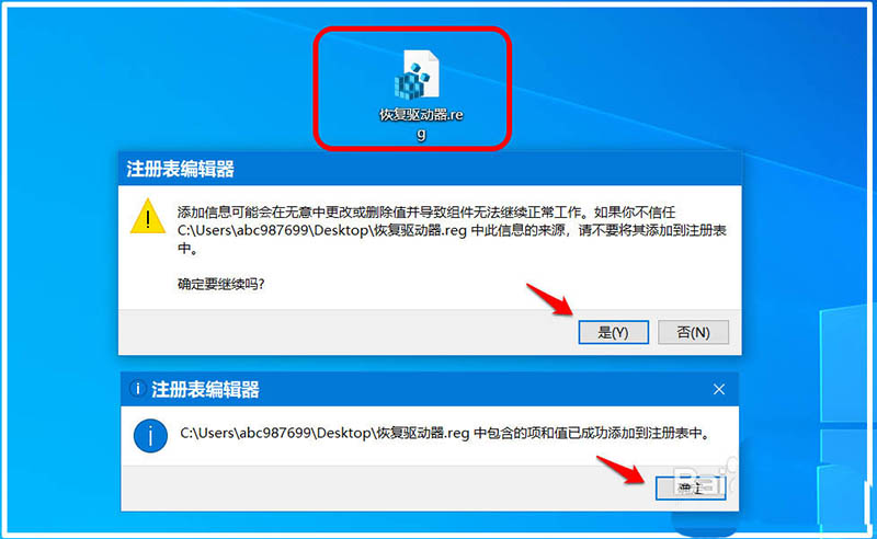 2、按照制作【隱藏驅(qū)動(dòng)器C、E.reg】注冊(cè)表文件的方法制作一個(gè)【恢復(fù)驅(qū)動(dòng)器.reg】注冊(cè)表文件,且左鍵雙擊,在彈出的注冊(cè)表編輯器對(duì)話框中先后點(diǎn)擊:是(Y)和確定。