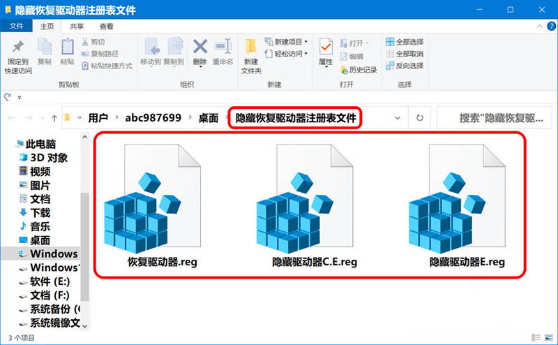 4、為使用方便,我們可以將上述的注冊(cè)表文件收藏到一個(gè)文件夾(可命名為:隱藏恢復(fù)驅(qū)動(dòng)器注冊(cè)表文件)中并放置到桌面上,需要時(shí),打開就可以使用了。
