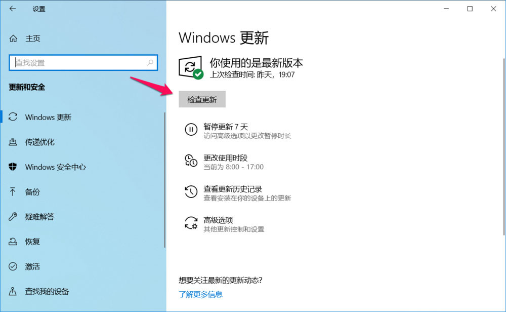 進入 設置 - Windows 設置 - 更新和安全 - Windows 更新,點擊:檢查更新;