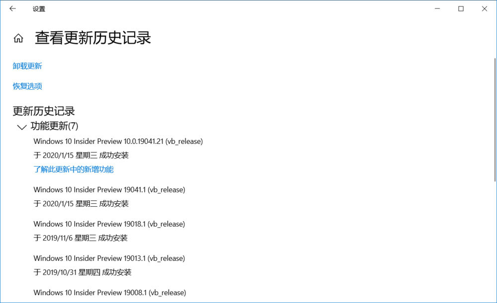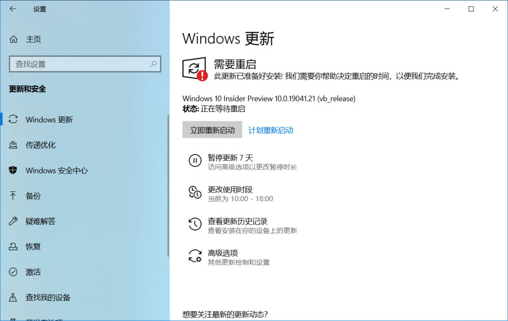 2、 更新Windows 10 Insider Preview 10.0.19041.21 (vb_release)系統(tǒng)