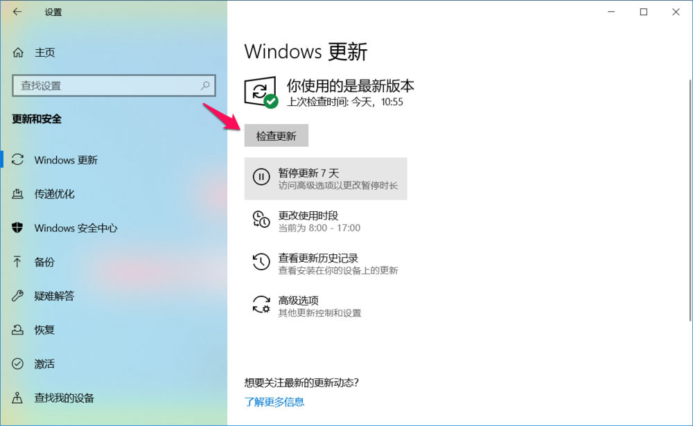 進(jìn)入 設(shè)置 - Windows 設(shè)置 - 更新和安全 - Windows 更新,點(diǎn)擊:檢查更新;