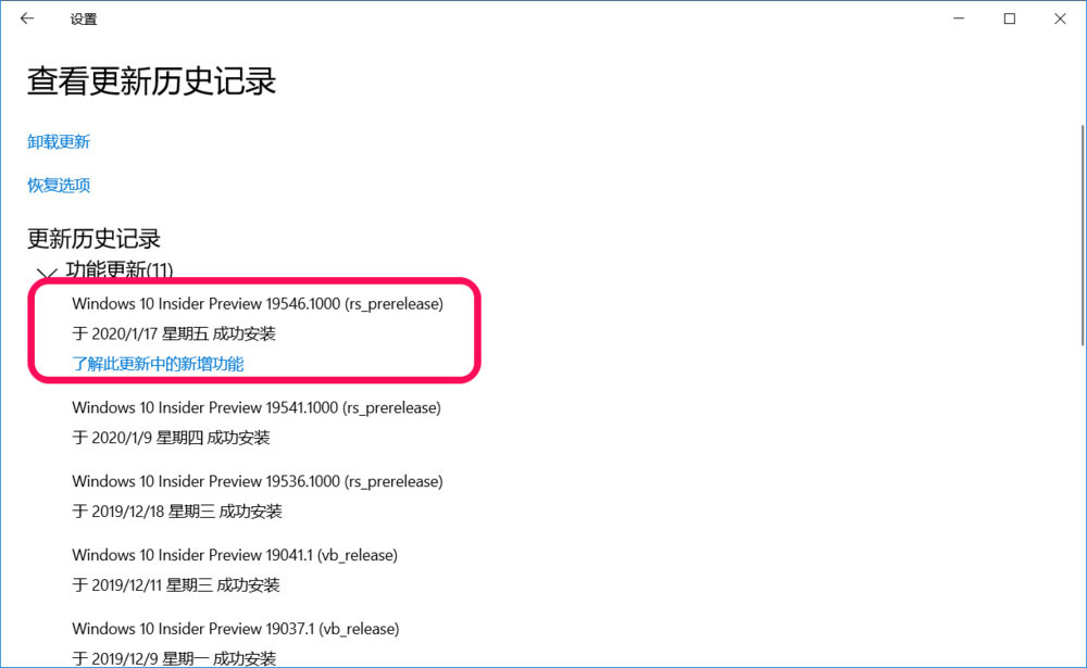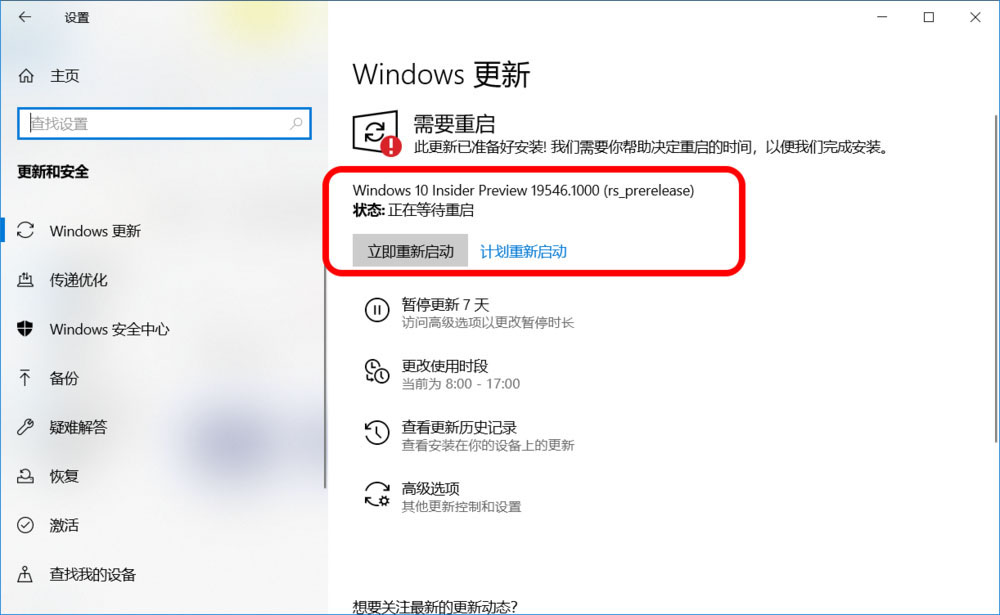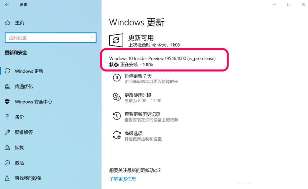 2、更新Windows 10 Insider Preview 19546.1000 (rs_prerelease)系統(tǒng)