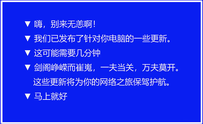 電腦最后一次重啟后,先進(jìn)行系統(tǒng)更新后的后續(xù)操作,共顯示五個(gè)界面: