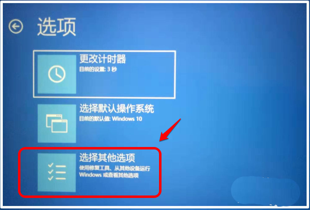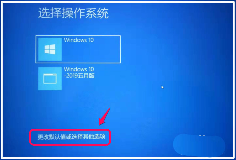 1、按下鍵盤上的開機鍵,啟動電腦,當出現(xiàn)【選擇操作系統(tǒng)】界面時,我們點擊:更改默認值或選擇其他選項;