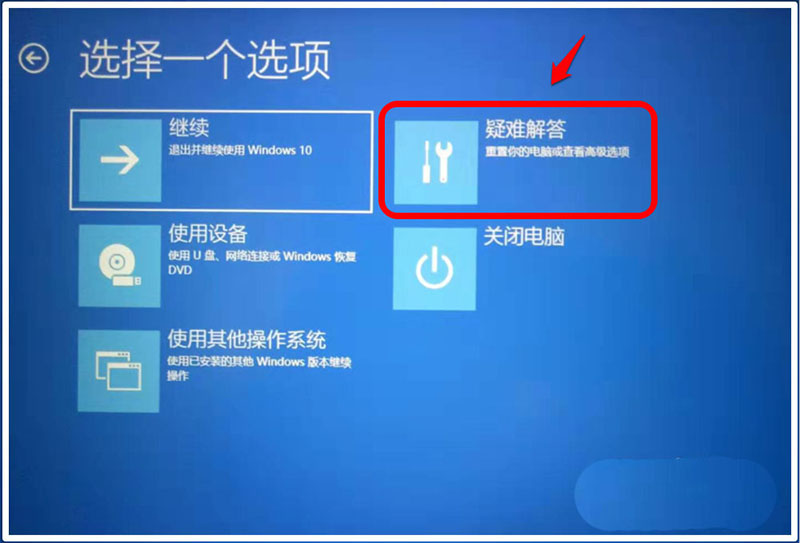 3、在接著打開的【選擇一個選項】界面窗口中,再點擊:疑難解答;