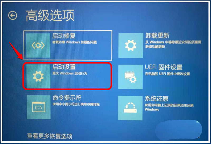 5、在【高級選項】界面窗口中,我們點擊:啟動設(shè)置;