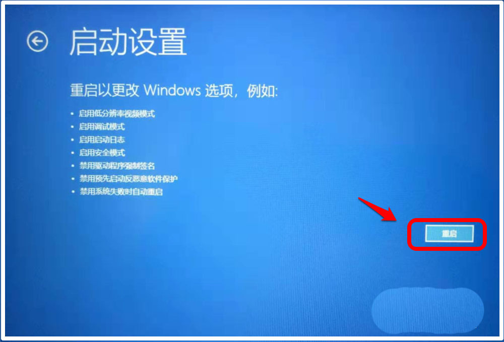 6、在【啟動設(shè)置】界面窗口中,點擊:重啟,電腦重新啟動;
