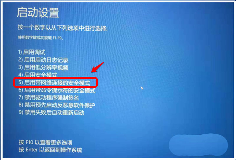 7、電腦重啟后,進入【啟動設(shè)置】界面,在此窗口中,我們可以看到有9項設(shè)置,根據(jù)解決問題的需要,我們按下鍵盤上的【F5】或數(shù)字【5】。再按下鍵盤上的回車鍵;