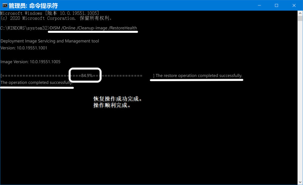 恢復(fù)操作成功完成。操作順利完成。但只完成了84.9%,沒有達到100%。