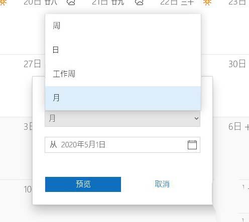 3. 此時(shí)日歷會(huì)彈出一個(gè)對(duì)話框,在這里選擇要打印的視圖樣式(周歷、日歷、工作周歷、月歷),樣式直接參考對(duì)應(yīng)日歷的視圖即可。此外它還提供了一個(gè)“預(yù)覽”按鈕,可以直接看到打印后的效果;