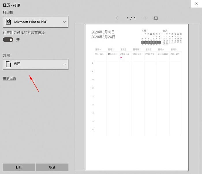 5. 順道說一句,Win10的這個(gè)日歷打印還支持橫縱互換,需要哪種直接選擇即可,非常方便;