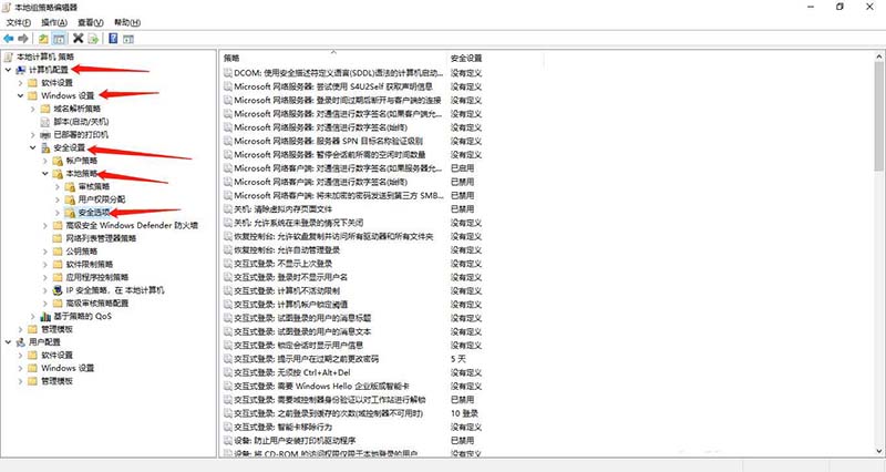 3、在“本地組策略編輯器”中,依次點開“計算機配置 – Windows設(shè)置 – 安全設(shè)置 – 本地策略 – 安全選項”路徑。