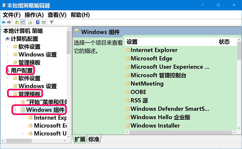 在打開的本地組策略編輯器窗口中,依次展開:用戶配置 - 管理模板 - Windows 組件;