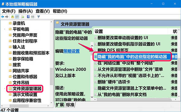 在Windows 組件的展開項中找到并點擊 文件資源管理器,在文件資源管理器對應(yīng)的右側(cè)窗口中找到并左鍵雙擊: 隱藏 我的電腦 中的這些指定的驅(qū)動器;