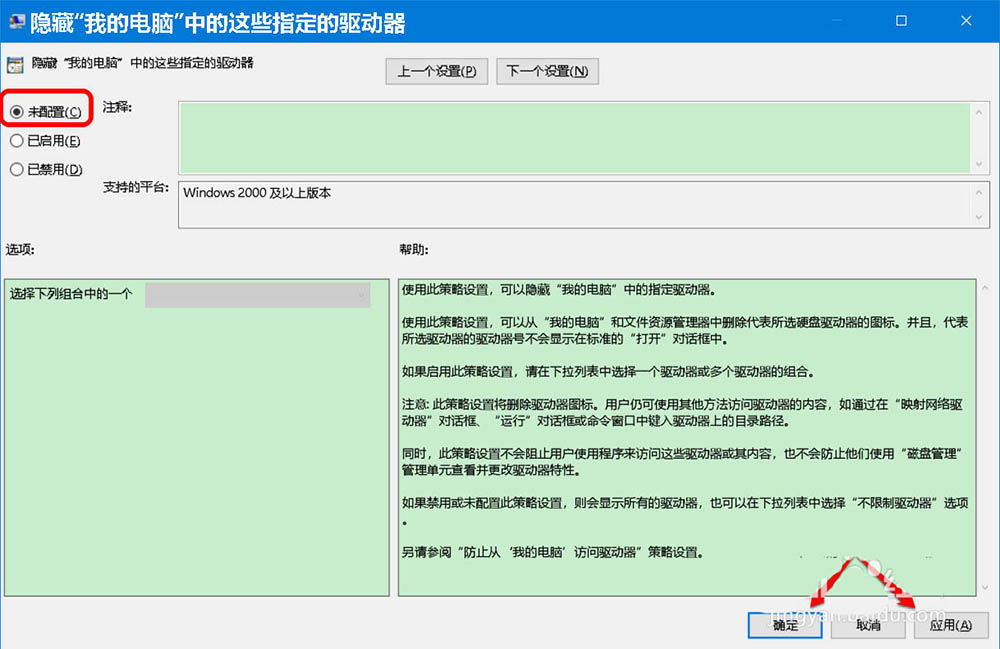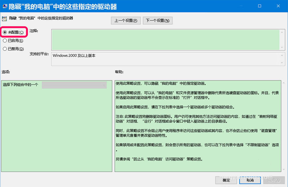在 隱藏 我的電腦 中的這些指定的驅(qū)動器 窗口中,我們可以看到其運行狀態(tài)為:未配置;